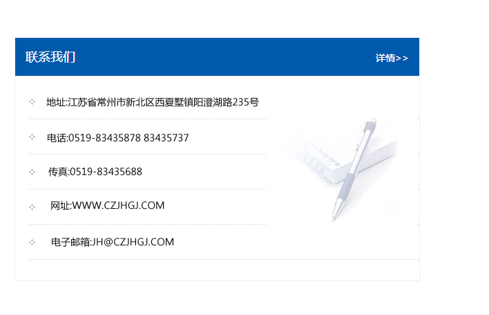 地址:常州市新北區(qū)友邦商務(wù)大廈1幢16、17層  電話:0519-85101652  傳真:0519-85112595  郵編:213022  網(wǎng)址:www.cz-jiayue_cn.lyajia.com  郵箱:xiajifengaa@163.com